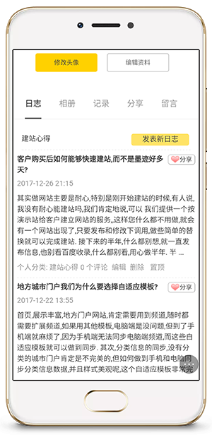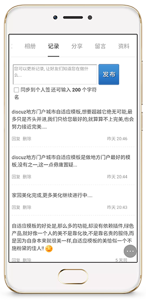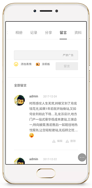本套模板的家园功能是最全的一个,虽然有些模板也有家园,但和我们比起来要简陋得多,因为我们的移动端完全继承了电脑版家园的一切功能,而且是绿色的,没有经过插件的污染,显得更加原生态