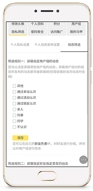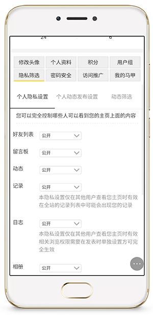 装扮空间,修改头像,个人资料(基本资料,教育信息,联系方式,工作情况,个人信息),积分的转账.记录.规则,用户组详情,购买用户组,我的权限,隐私设置,发布设置,动态筛选,密码安全,访问推广,我的马甲等