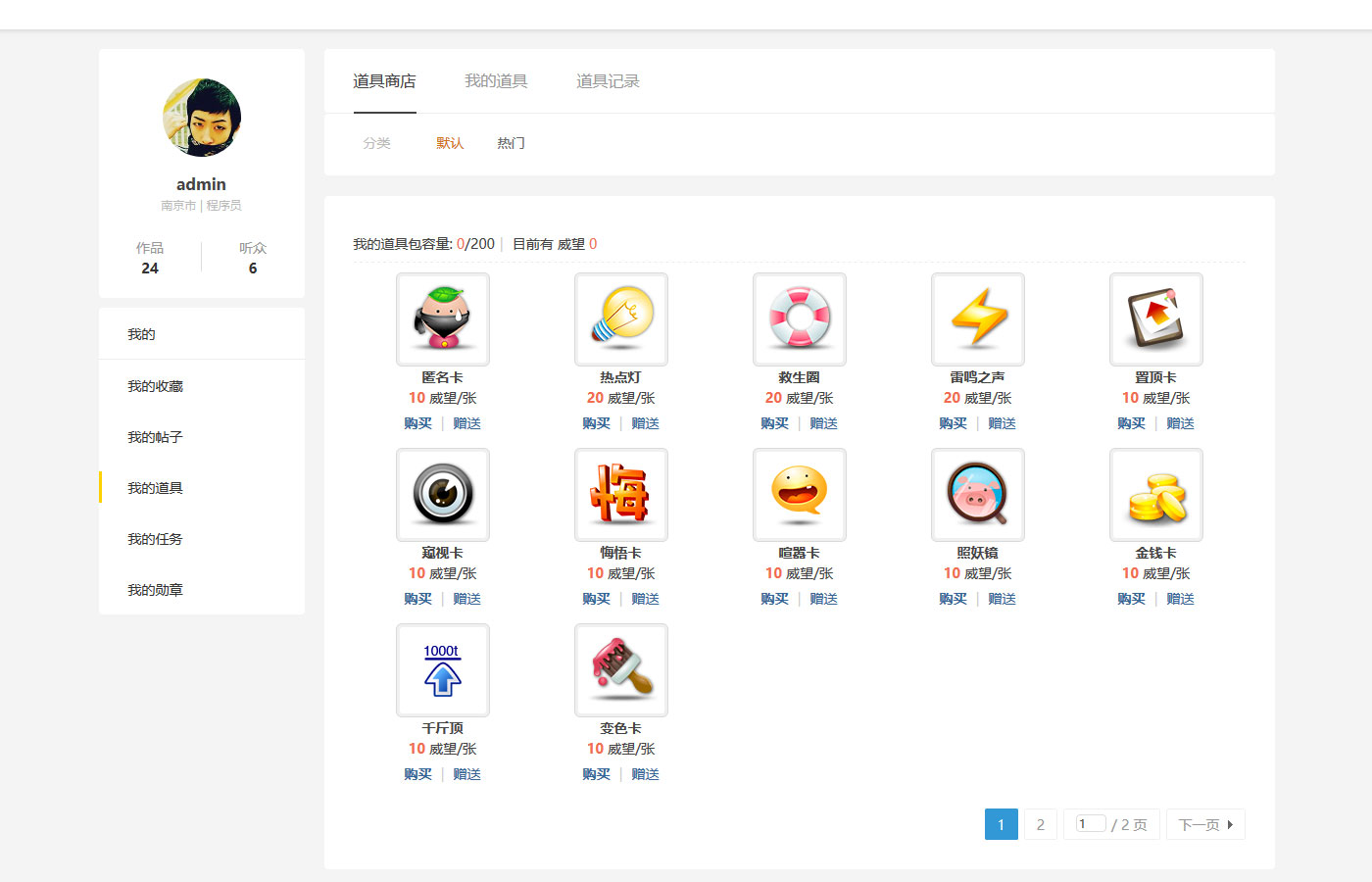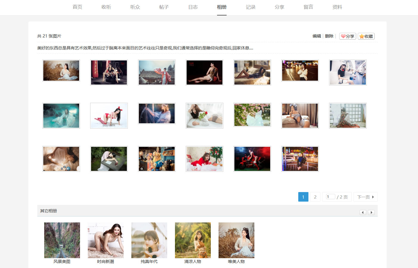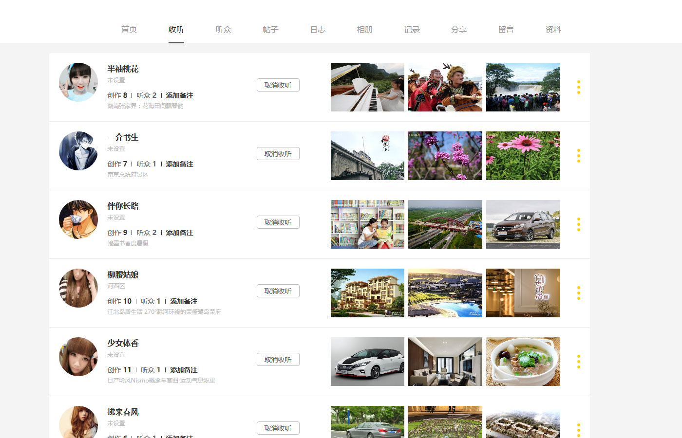 粉丝,收听,日志,记录,相册,分享,留言,资料,我的帖子,收藏,道具,勋章,任务......